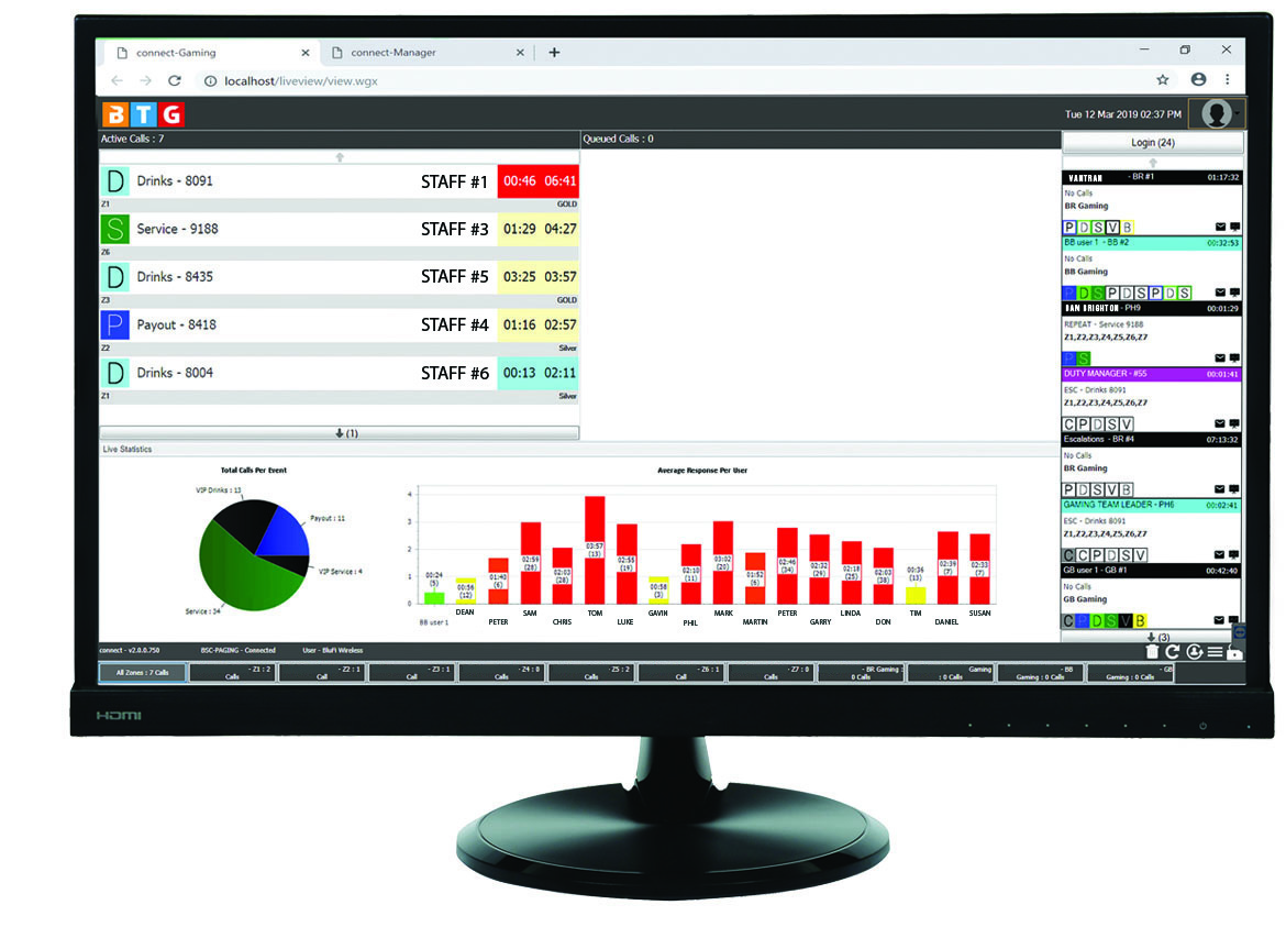 The Connect Gaming system integrates directly with all Gaming Loyalty Systems to alert gaming attendants when an event arises like a payout or drink request. All events are queued to ensure the first patron to request service, is the first one attended to. Calls rotate evenly to all attendants who are logged on to the system. Attendants receive messages via Android Smartphone, Android Smartwatches, RF pagers, DECT phones, SMS to mobile phones from Connect Gaming system.
